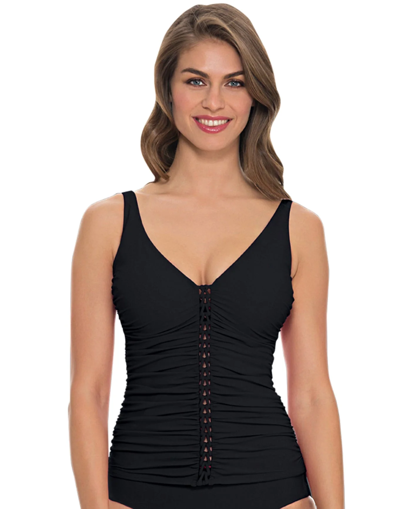 ACCENTUATE BUST WITH V-NECKLINE. VISUALLY SLIM TORSO WITH SIDE SHIRRED BODICE. SOFT MOLDED D-CUP BRA. 72% POLYAMIDE / 28% ELASTANE. TANKINI TOP FITS TRUE TO SIZE.