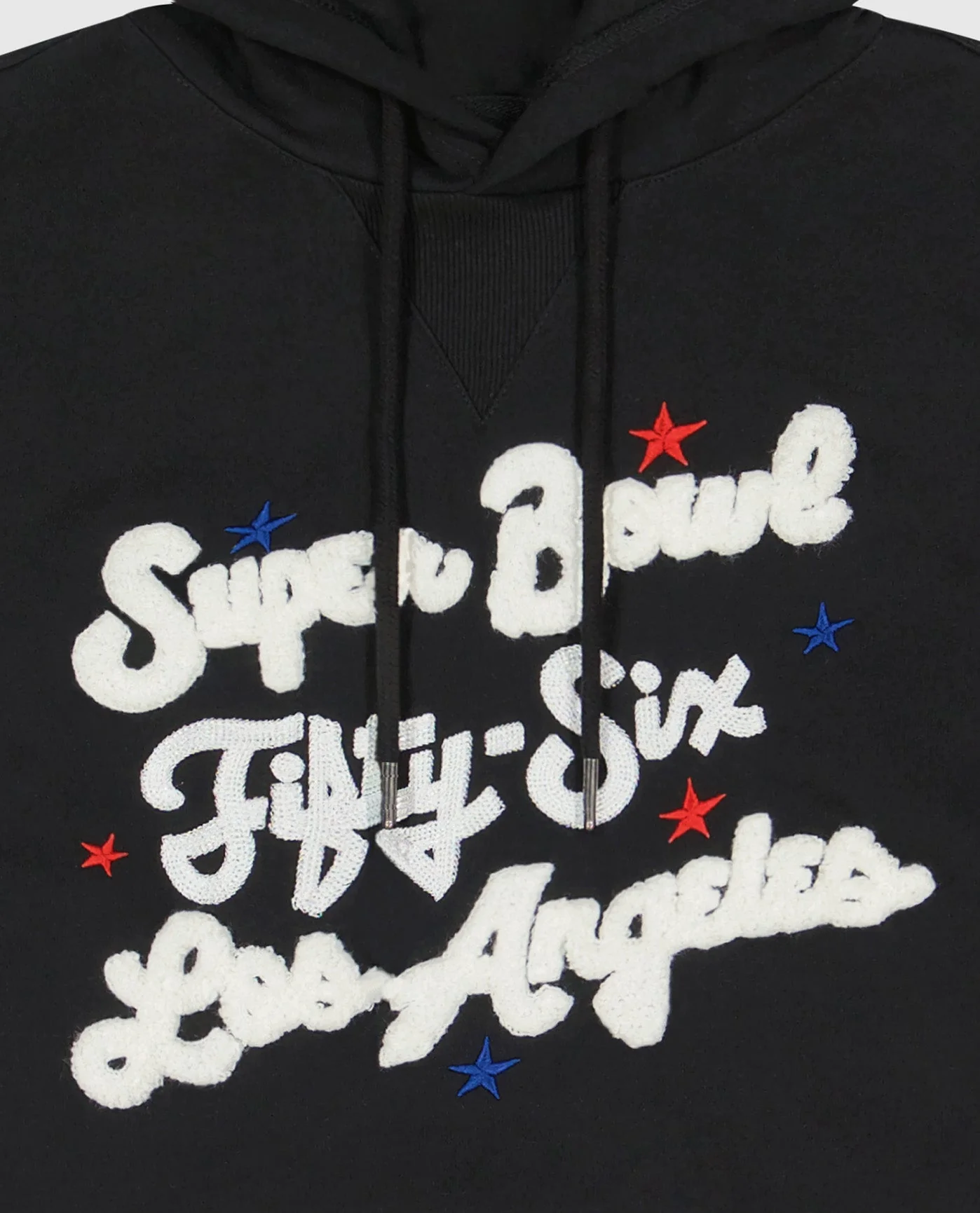 SUPERBOWL LVI LIMITED EDITION. FLEECE HOODIE. SOLID BLACK BODY. CONTRAST RIB KNIT AT CUFF AND WAISTBAND. SEQUIN GRAPHIC ON FRONT. CONFRENCE LOGOS ON SLEEVES. STARTER BRANDED EMBROIDERY AT LEFT CUFF.